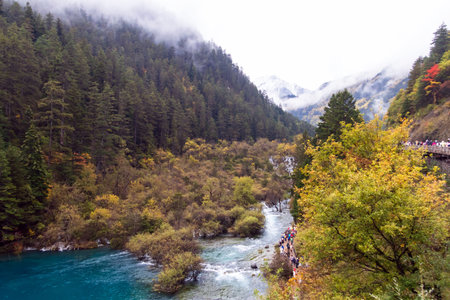 An autumn forest river valley with turquoise water, misty mountains and scenic wooden walkway, peaceful atmosphere at Jiuzhaigou in Sichuan, China