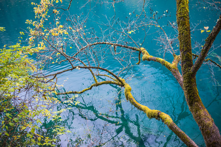 Amazing colors of mossy tree and deep lake at Jiuzhaigou Valley National Park, China