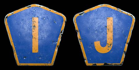 Set of public road signs in blue and orange color with a capital letters I and J in the center isolated black background. 3d rendering