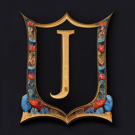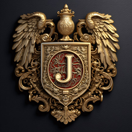 Graphic alphabet letters: Luxury heraldic shield with letter J. Black background.