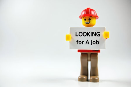 Close up of Lego figure holding a sign with the word LOCKING FOR A JOB. Studio shot.
