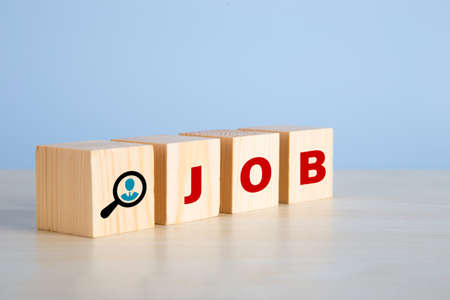 The word job on wooden cubes with on blue background. Searching for a job, employment, recruitment or career in business concept.