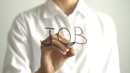 Woman writing JOB on transparent screen. Businesswoman write on board.