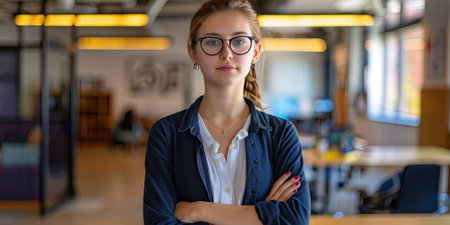Confident businesswoman smiling in modern office, exuding professionalism and success. Blurred background adds elegance, emphasizing her stylish appearance. Panorama banner