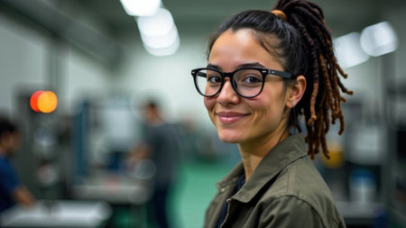 Portrait of cute hipster woman with glasses, Caucasian appearance, dreadlocks, working at the factory.