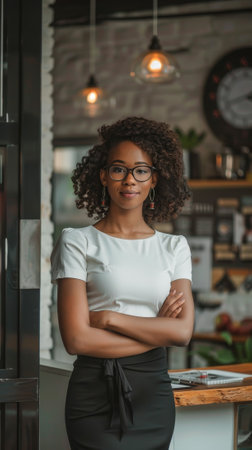 Woman with arms crossed in the middle of a workspace generative ai