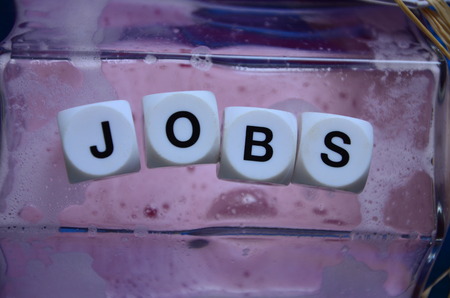 Word jobs on dark background, work announcement, hiring and unemployment concept