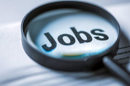 A close-up of a magnifying device highlighting the term jobs amid print articles, symbolizing a diligent hunt for career prospects in today's dynamic job market.