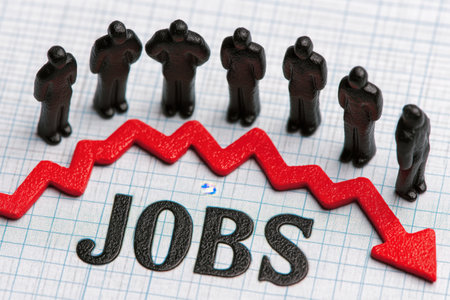 An economic concept of job loss and unemployment, showing miniature figures standing by the word 'JOBS' on graph paper with a jagged red arrow pointing down.