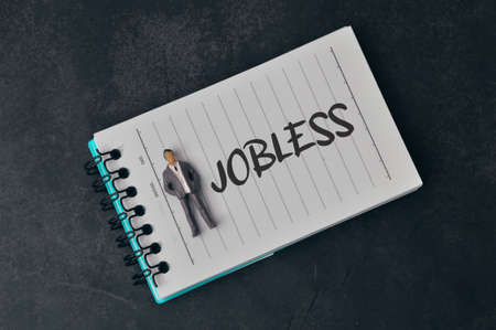 Top view of people miniature and notebook written with text JOBLESS.