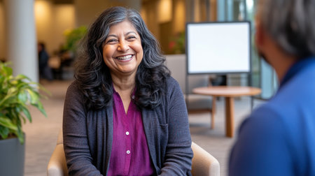 A diverse group of professionals engaged in a collaborative meeting at a modern workspace, smiling and sharing ideas during the afternoon