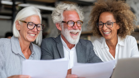 Three cheerful individuals, older man with gray hair and glasses, and two women with different hairstyles, are engaged lively discussion while reviewing documents together. Their expressions