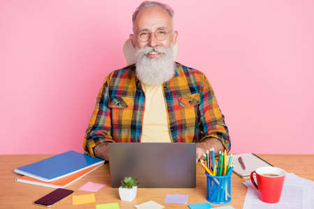 Portrait of attractive cheery intelligent grey-haired man learning web courses it project isolated over pink pastel color background