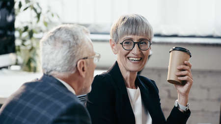 Cheerful mature businesswoman holding coffee to go near blurred colleague in office
