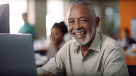 Black senior man enjoying work in a bustling, collaborative coworking office space.