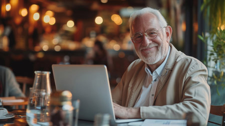 Smiling mature man working at home with a laptop, sitting in a bright and creative workspace, conveying productivity, confidence, and a modern lifestyle. High quality photo
