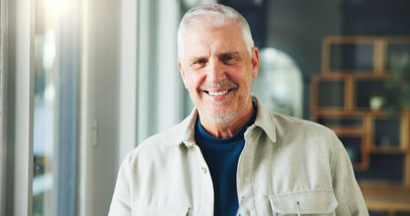 Smiling elderly man wearing glasses sitting in casual indoor setting. Confident senior businessman working in modern office. Portrait of mature corporate worker