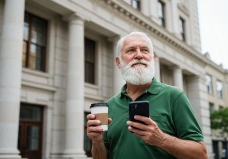 A senior man with a white beard and hair, wearing a green polo shirt, holds a coffee cup and smartphone while standing outside a building.