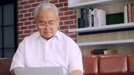 Technology concept, senior citizen using laptop at home. Work from home sitting at the work desk for conference call