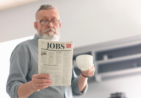 Business partner executive smart man drinking coffee and reading newspaper in restaurant. Senior caucasian man waiting your partner for meeting and taking about work. Business Concept
