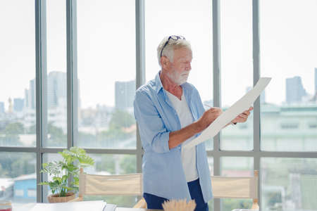 Elderly senior man in casual outfit art paint working with happy and focus emotion in modern room.