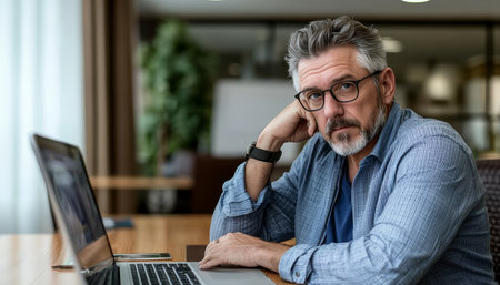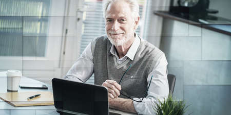 Grey Bearded mature man creative director sitting in modern office working with laptop computer on wooden desk. stylish design interior