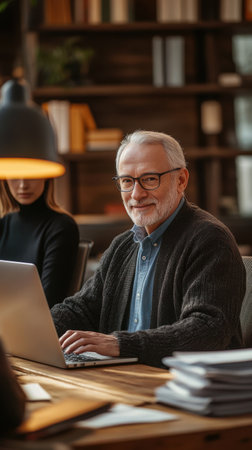 A man, wearing glasses and a cardigan, works intently on his laptop in a warm, inviting office senior filled with books. A woman sits nearby, focused on her task.