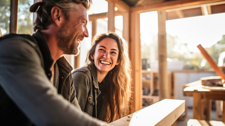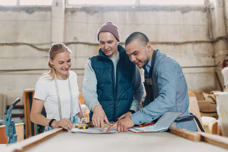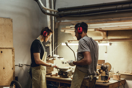 Young couple of carpenter working and crafting with wood in a workshop building furniture for interior design. Young couple entrepreneurs running a small business in a carpentry. Business people.