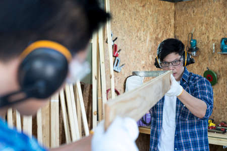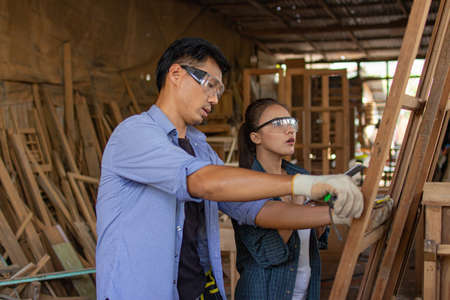 Two asian carpenters in a construction workshop. business man and woman working together woodwork