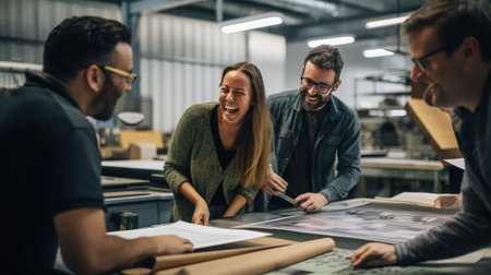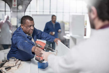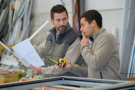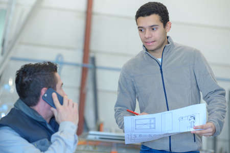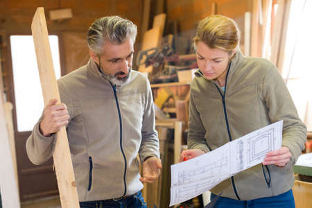 Two colleagues carpenters discussing and working with a technical blueprint drawing construction paper in their workshop illustrating models on a board