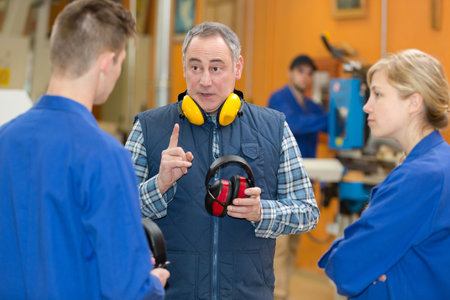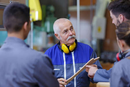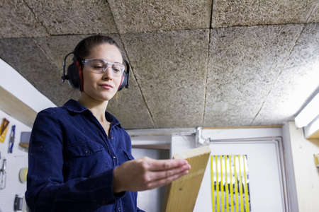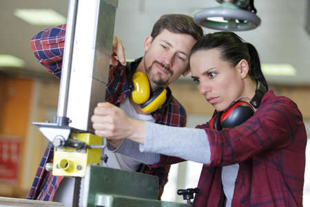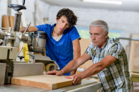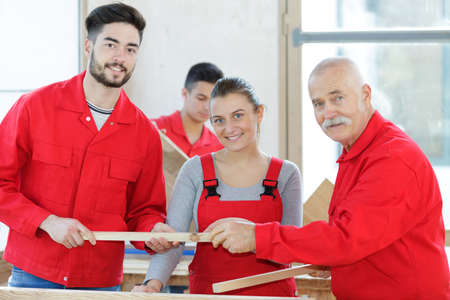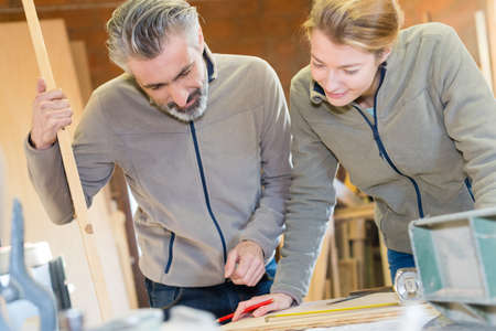 Carpenter apprentice and instructor check a wooden board in the carpentry