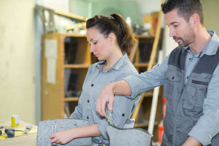 Man and woman working in workshop, doing furniture, reuse old materials to new product. awareness in consumption. Small family business. Recycling, sustainability refurbishments maintenance for home