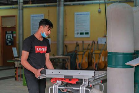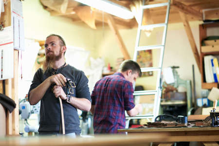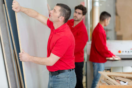 Carpenters working in teamwork. Two young man as carpenter work in the workshop.