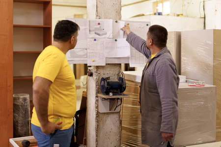 Two workers are considering the process of assembling furniture in the furniture shop. Toned image. Draw an analysis of the drawing on the table