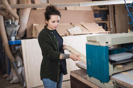 Business woman in Industrial Carpentry factory - production of wooden boards with modern machines