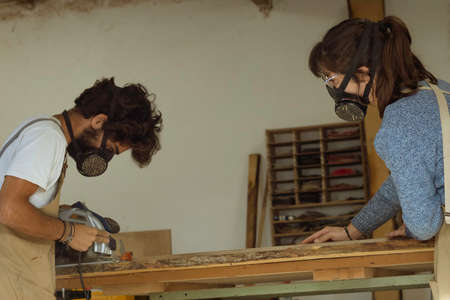 A young couple of carpenter working together in a small wood laboratory using a drill machine for timber. Couple crafting new home furniture in a carpentry workshop. young entrepreneurs concept