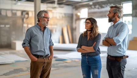 Professionals meeting with a construction manager in an empty loft, discussing renovation plans and timelines for their new creative workspace.