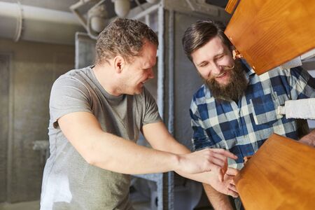 Craftsman apprentices as furniture makers glue a cabinet in the joinery