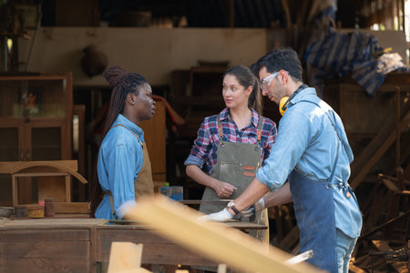 Warm toned portrait of female artisan consulting clients in carpentry workshop