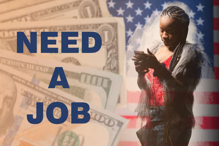 Girl is looking for a new job. Woman next USA flag. Girl asks for unemployment benefits. Unemployment in USA