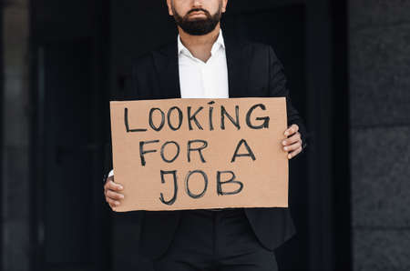 Male office worker in suit holding cardboard sign written looking for a job text, standing outside business center