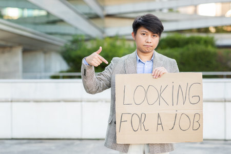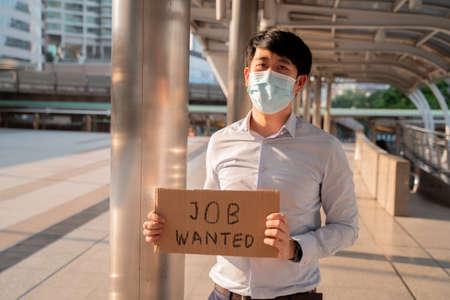 Young upset Asian man wearing protective face mask asking for job via message on signboard after losing job due to pandemic and outbreak