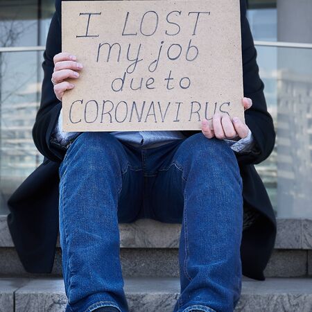 Job loss due to COVID-19 virus pandemic concept. Unrecognizable man holds sign I lost my job because of coronavirus. Male sitting on stairs of building, former place of work in business center