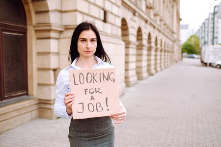 Young woman with blond hair and blue eyes thinking , standing with a plaque indicating that is searching new job. Coronavirus, problem, work deficit during the pandemic. High quality photo