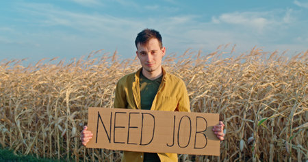 Farmer stands in front of a cornfield holding a cardboard sign that reads Need Job.