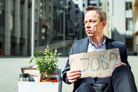 Looking for a job. Upset mature man sitting on stairs with box of personal stuff and poster, got fired due to crisis