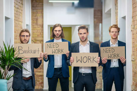 Unemployed, bankrupt. Four sad young adult men with placards in hands standing silently in office corridor