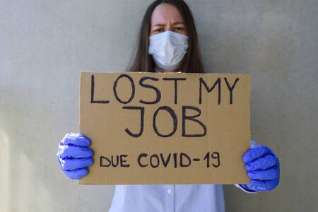 Woman office worker in blue shirt with cardboard sign LOST JOB. Jobless, unemployment due covid-19 concept. Asking for money