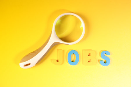 Magnifying glass over the word jobs on a yellow background. Job concept.