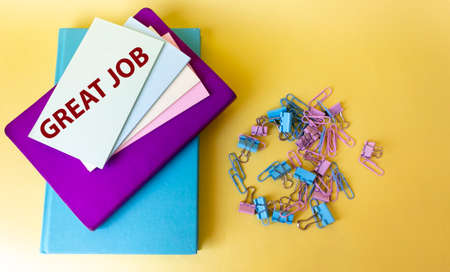 Great Job is written on a sticker that lies on notepads and a yellow background. Nearby are colored paper clips.